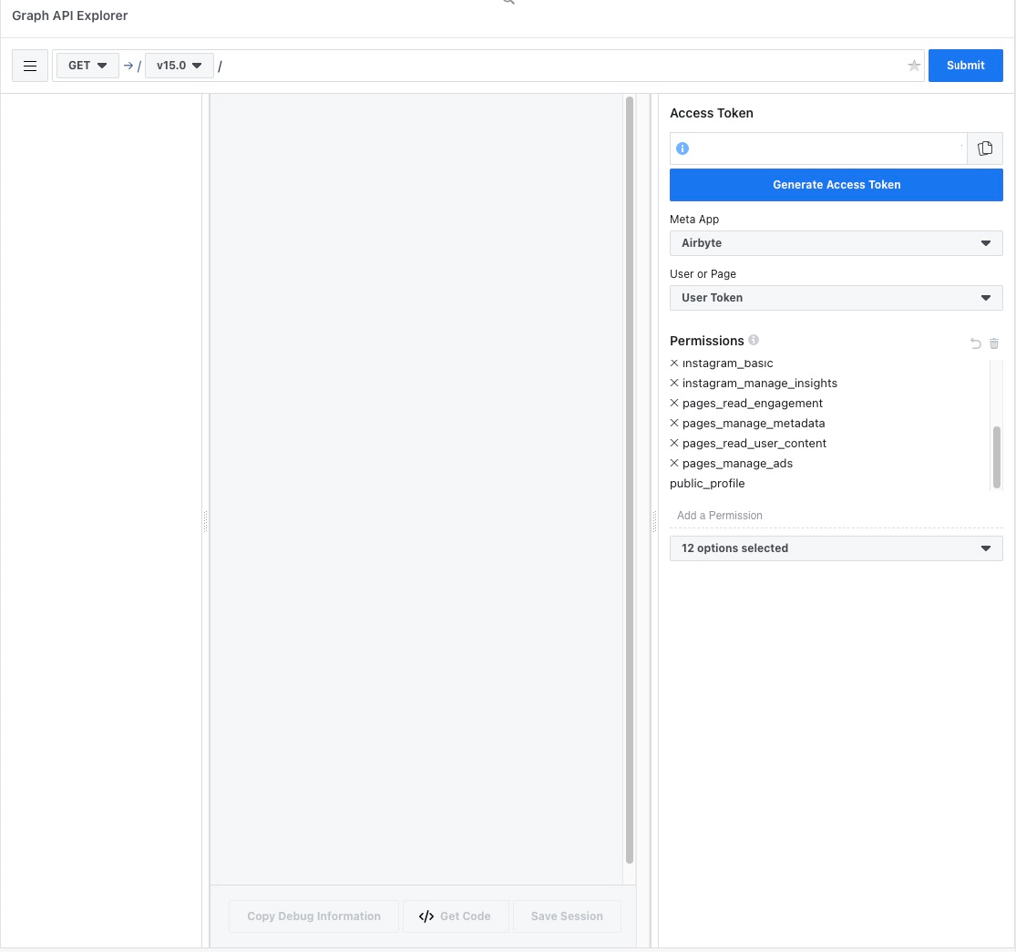 3. Connect a User Page using the Graph API Explorer. Choose your app in the Meta App field. Choose your Page in the User or Page field. Add the following permissions: